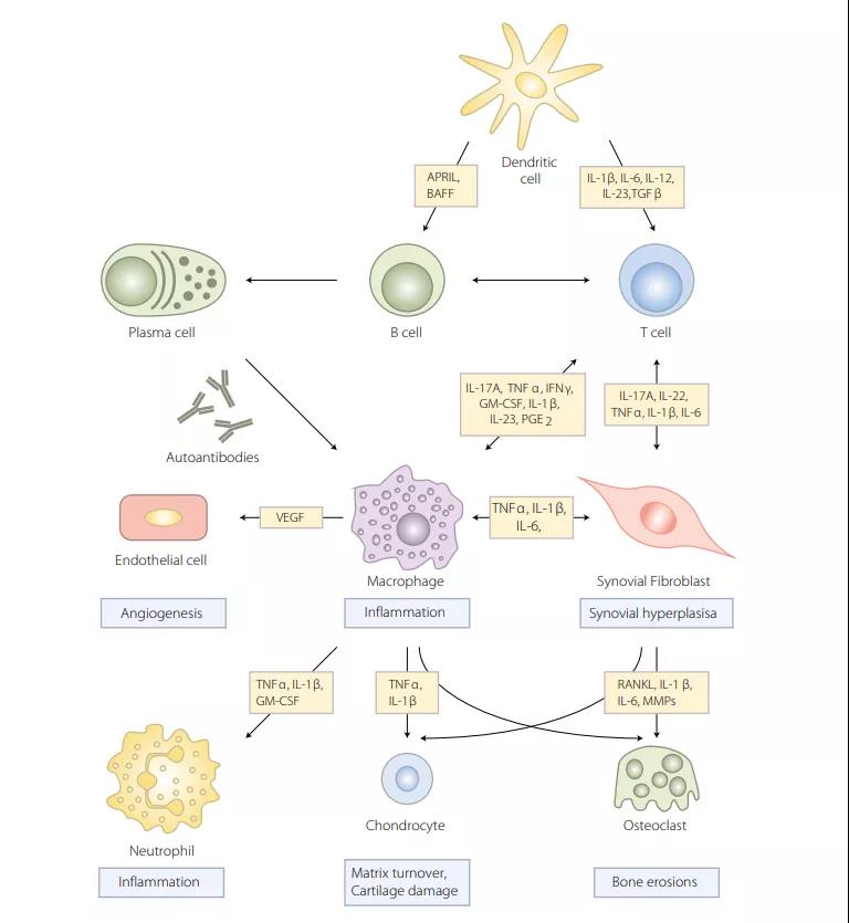 RA主要的三個病理特征為:炎癥、滑膜增生、骨破壞。與之相對應的參與發病的細胞有:免疫細胞、滑膜細胞、成骨細胞和破骨細胞。