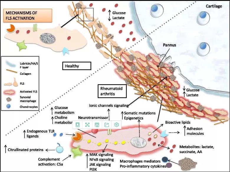包括兩類,巨噬細胞樣滑膜細胞和成纖維細胞樣滑膜細胞(FLS),FLS在RA發病過程中扮演了重要的角色,是RA滑膜組織中最常見的細胞類型。RA關節中的促炎環境(包括高水平的細胞因子、生長因子及浸潤的炎性細胞)強烈激活FLS,FLS產生炎性因子,促進細胞基質降解導致軟骨和骨的持續性破壞,同時還刺激滑膜細胞增殖,遷移并侵蝕破壞關節軟骨,導致畸形[6] 。